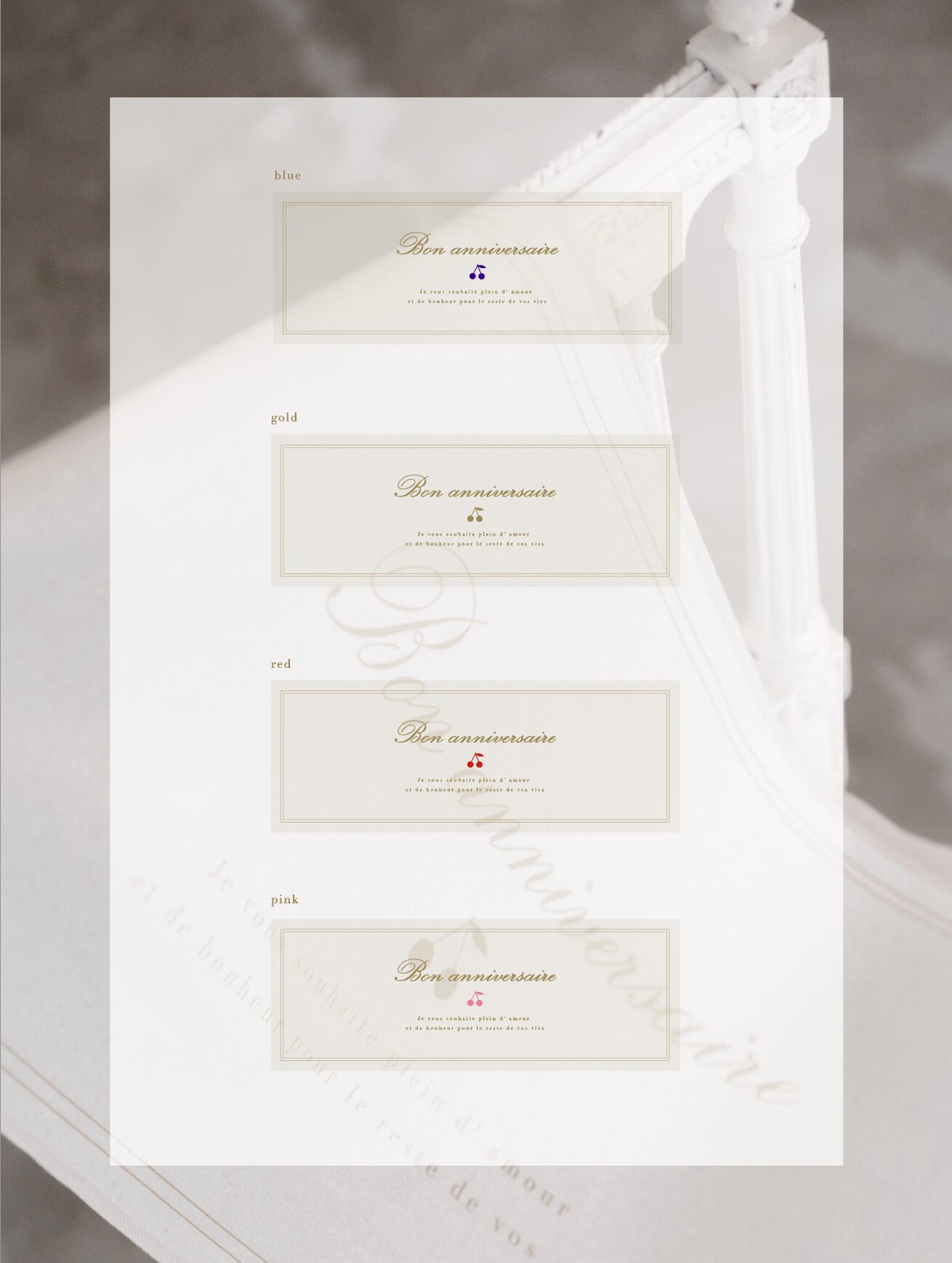 チェリーのカラー:ゴールド、ピンク、レッド、ブルー(※レッド、ブルーのみ絵型参照)